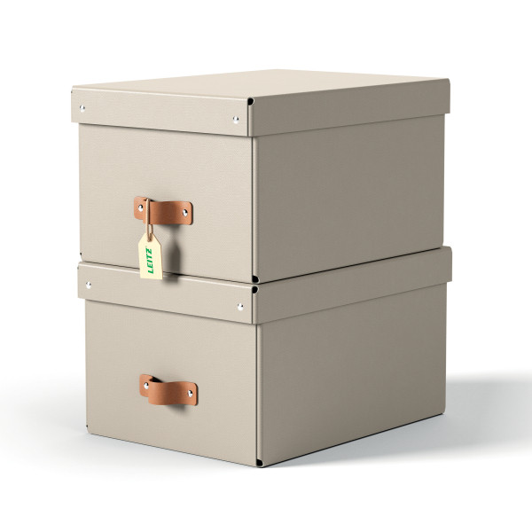 Két, közepes méretű, 17L űrtartalmú, fedeles kartondoboz-készlet. Könnyen összeszerelhető, ideális A4-es dokumentumok és egyéb tárgyak tárolására. 100%-ban újrahasznosított kartonból. Méret mm: 265, 200, 355